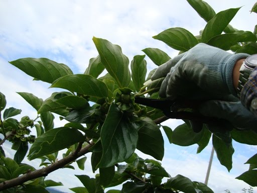 主人はハサミでまじめに摘果作業 クミは、蚊取り線香を腰に付け、ナイス蚊っち。を手に奮闘中~♪