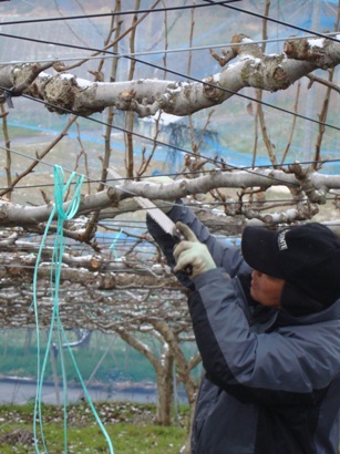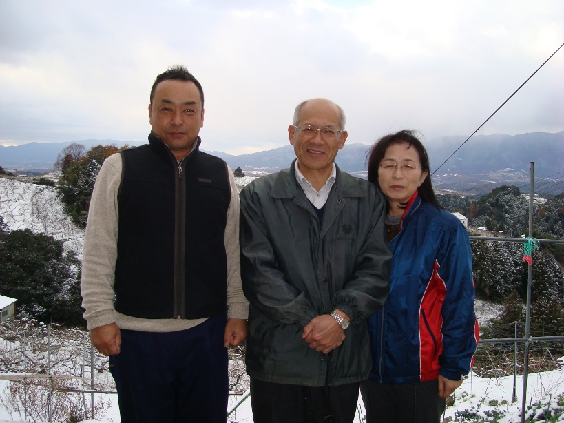 この雨の中も畑に出向き、柿の若木の世話に一生懸命です